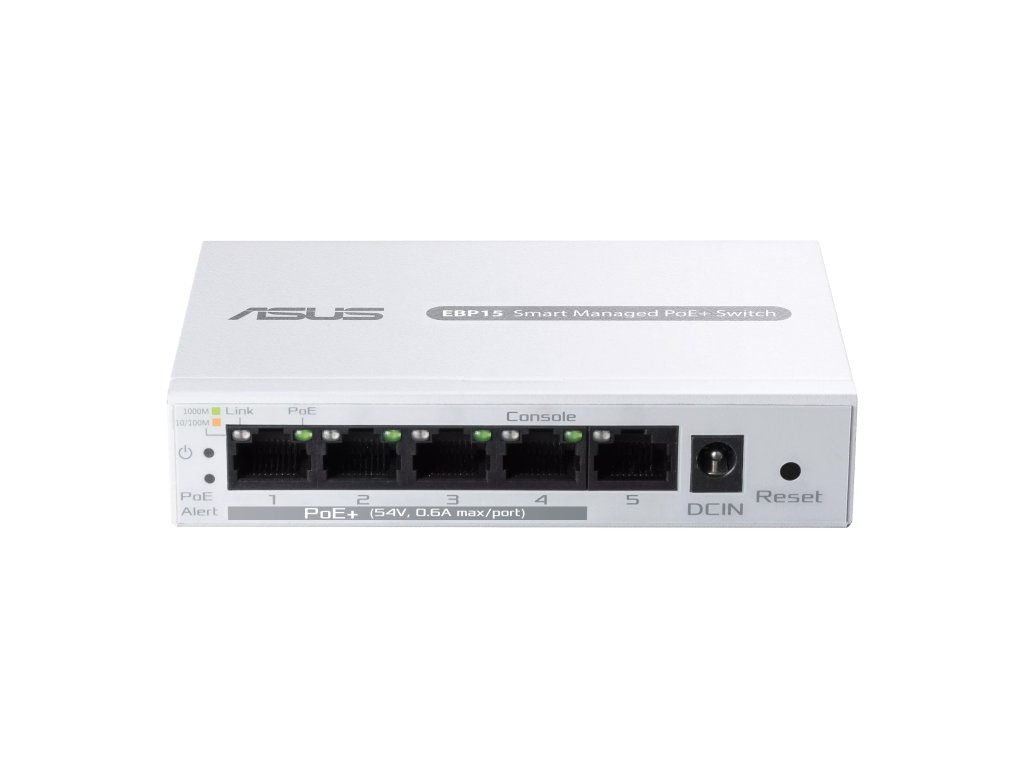 ASUS ExpertWiFi EBP15 5portový GbE Smart Managed PoE+ Switch 5portový GbE smart switch PoE+, 4 porty PoE+, 60 W, podporuje nastavení priority PoE, ideální pro PoE AP, IP kamery, VoIP telefony, centralizovaná správa aplikací s routerem ExpertWiFi