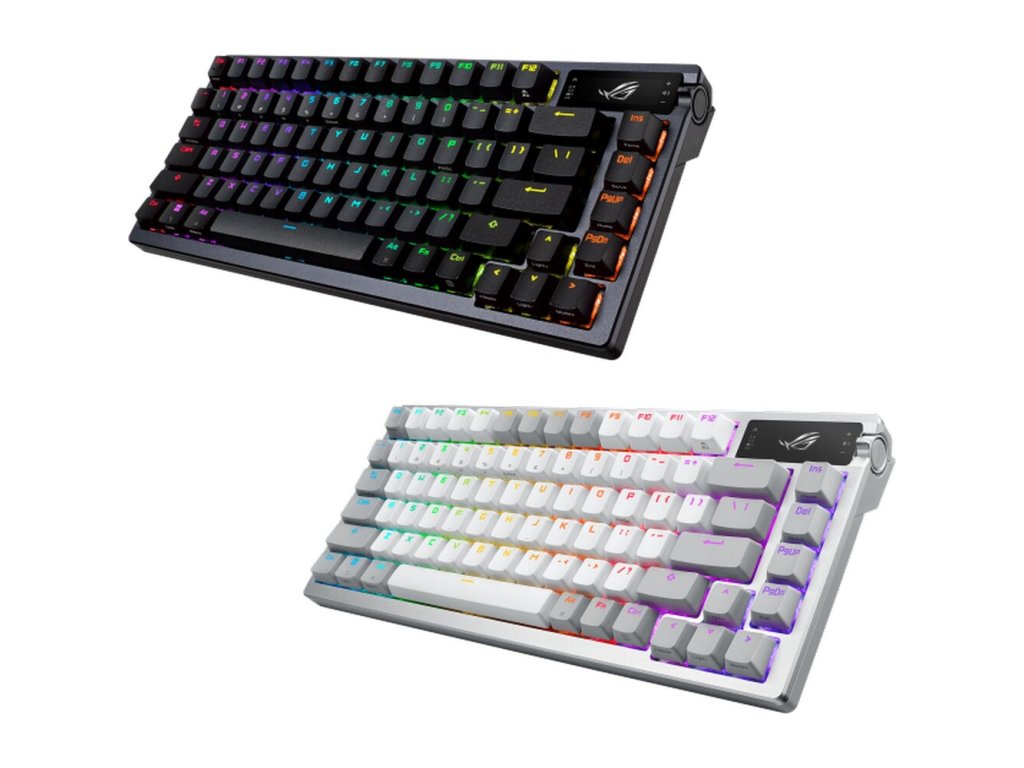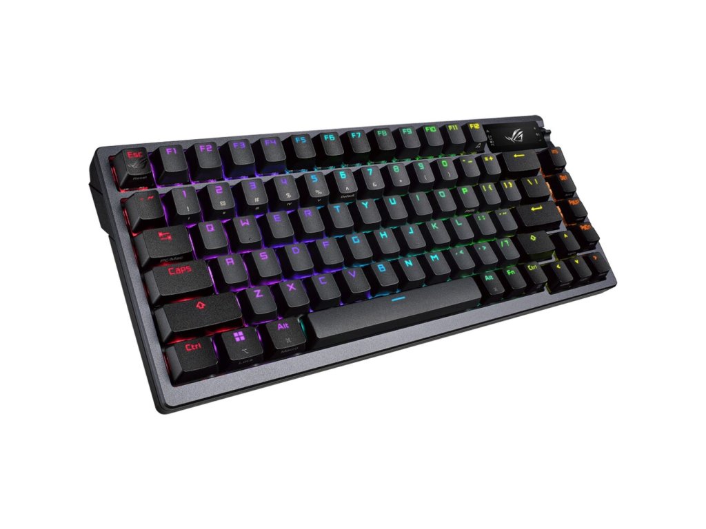 Zakázková herní klávesnice ROG Azoth s tvarovým faktorem klávesnice 75, těsněním, třívrstvou tlumicí pěnou a kovovým horním krytem, vysoce přizpůsobitelná s předem namazanými mechanickými spínači ROG NX vyměnitelnými za provozu, stabilizátory klávesnice ROG, kryty kláves PBT doubleshot a mazací sadou, tri - připojení režimu s 2,4 GHz technologií SpeedNova, OLED displejem, třícestným ovládacím knoflíkem, třemi úhly náklonu a podporou Mac