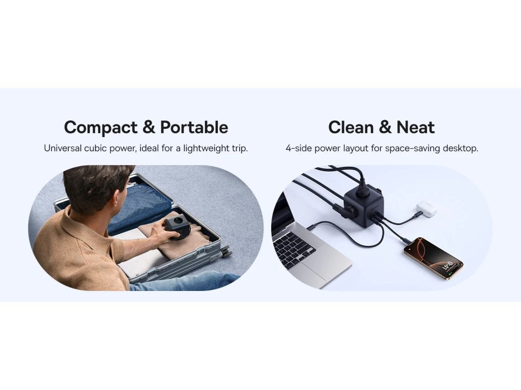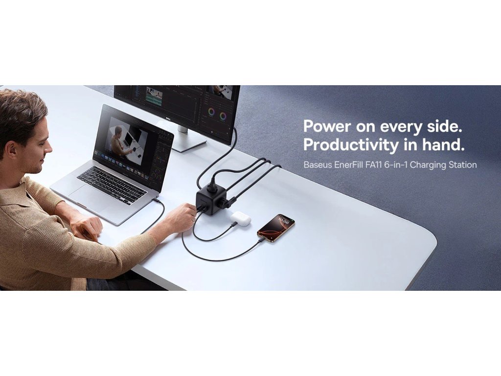 Potřebujete mít pod kontrolou nabíjení více zařízení najednou – ať už doma, v kanceláři nebo na cestách? Baseus EnerFill FA11 je kompaktní, výkonná a moderní nabíjecí stanice 6v1, která nabízí rychlé až 67W nabíjení, univerzální konektivitu a vysokou úroveň bezpečnosti. Skutečně univerzální 6v1 řešení 3× AC zásuvka pro běžné spotřebiče 2× USB-C porty 1× USB-A port Díky tomu můžete pohodlně nabíjet notebook, telefon, tablet, sluchátka i další zařízení současně z jednoho místa. Rychlé nabíjení až 67 W Technologie GaN6 zajišťuje vysokou efektivitu a kompaktní rozměry. USB-C porty podporují výkon až 67 W při samostatném použití, což je ideální pro notebooky, iPady nebo moderní telefony. Při využití více portů se výkon inteligentně rozděluje podle potřeby. Výstupní kombinace: USB-C1 nebo USB-C2 samostatně: až 67 W USB-A samostatně: až 18 W USB-C1 + USB-C2: 45 W + 20 W USB-C1 + USB-A: 45 W + 18 W USB-C2 + USB-A: max. 15 W Všechny tři porty současně: 45 W + 15 W Chytré a bezpečné řešení Baseus EnerFill nabízí řadu ochranných prvků pro maximální bezpečnost a spolehlivost: Ochrana proti přepětí Ochrana proti přetížení proudu Ochrana proti zkratu Ochrana proti přehřátí Ochrana proti přepólování Ohrana uzemnění Elektrostatická ochrana Praktický design a snadné ovládání Rozložení zásuvek na čtyřech stranách umožňuje úsporu místa a pořádek na stole Kompaktní rozměry a nízká hmotnost usnadňují přenášení a používání i na cestách Jednotlačítkový spínač pro bezpečné zapnutí a vypnutí nabíjení Přepínač automaticky vypne napájení při přetížení na AC nebo USB portech Vlastnosti: Model: Baseus EnerFill FA11 Výkon: až 67 W (USB-C) Počet portů: 3× AC, 2× USB-C, 1× USB-A Technologie: GaN6 pro vyšší účinnost a menší rozměry Rozměry: kompaktní, snadno přenosná Bezpečnostní funkce: komplexní ochrany proti přepětí, zkratu, přehřátí a dalším rizikům Ovládání: jedno tlačítko zapnutí/vypnutí s automatickým přerušením při přetíženíDoplňkové parametry