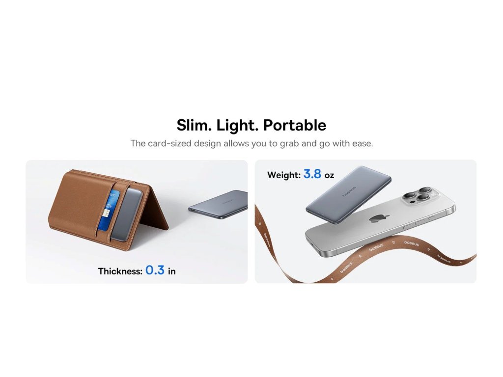 Ultra tenká a lehká powerbanka s magnetickým uchycením Baseus PicoGo je navržena pro budoucnost mobilního nabíjení. S tloušťkou pouhých 7,6 mm a hmotností 107 g je lehčí než iPhone a připomíná svou velikostí platební kartu. Díky tomu ji můžete snadno nosit v kapse, peněžence nebo kabelce – skoro o ní nevíte, dokud ji nepotřebujete. Druhá baterie pro váš telefon Powerbanka slouží jako ideální doplněk pro každodenní použití – dodává energii přesně tehdy, když ji potřebujete. Díky magnetickému uchycení stačí jen „přicvaknout“ a nabíjení začne automaticky. Prémiové materiály a elegantní design Kombinace hliníkové slitiny a měkkého silikonu zajišťuje nejen stylový vzhled, ale i komfort při používání. Powerbanka je odolná proti poškrábání, otiskům prstů a je příjemná na dotek. Stabilní a přesné magnetické přichycení S magnetickou silou 11 N a přesným zarovnáním díky 1:1 magnetickému prstenci drží pevně na zadní straně telefonu bez klouzání nebo přerušení nabíjení. Chytrá ochrana a průběžné nabíjení Vestavěný AI čip reguluje teplotu a optimalizuje nabíjení pro bezpečný provoz. Díky průchozímu nabíjení můžete zároveň dobíjet telefon i samotnou powerbanku. Specifikace: Kapacita: 5000 mAh Materiál: hliníková slitina, silikon Vstup (USB-C): 5V/3A, 9V/1.67A Výstup (USB-C): 5V/2.4A, 9V/2.22A, 12V/1.5A (až 20W) Bezdrátový výstup: 5W / 7,5W / 15W Celkový výstup: 5V/2.4A Magnetická síla: 11 N Rozměry: 99 × 66 × 7,6 mm Hmotnost: 107 g Funkce průchozího nabíjení: Ano USB-C Kabel součástí baleníDoplňkové parametry