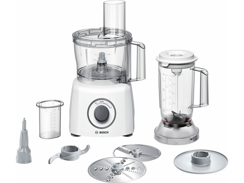 Bosch MCM3200W. Obsah nádoby: 2,3 l, Barva: Bílá, Typ ovládání: Otočné. Materiál nádoby: Plast, Materiál nože: Nerezová ocel. Příkon: 800 W. Šířka: 375 mm, Hloubka: 220 mm, Výška: 260 mm. Včetně misek: Sekací, MícháníDoplňkové parametry
