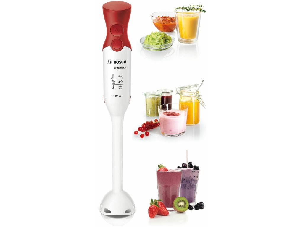Bosch MSM64010. Model: Ponorný mixér, Barva: Červená, Bílá, Délka šňůry: 1,4 m. Typ ovládání: Knoflíky. Materiál mixovací mísy: Plast, Základní materiál: Plast, Materiál ostří: Nerezová ocel. Příkon: 450 W, Napájecí zdroj: AC, Vstupní střídavé napětí: 220 - 240 V. Šířka: 55 mm, Hloubka: 62 mm, Výška: 393 mmDoplňkové parametry