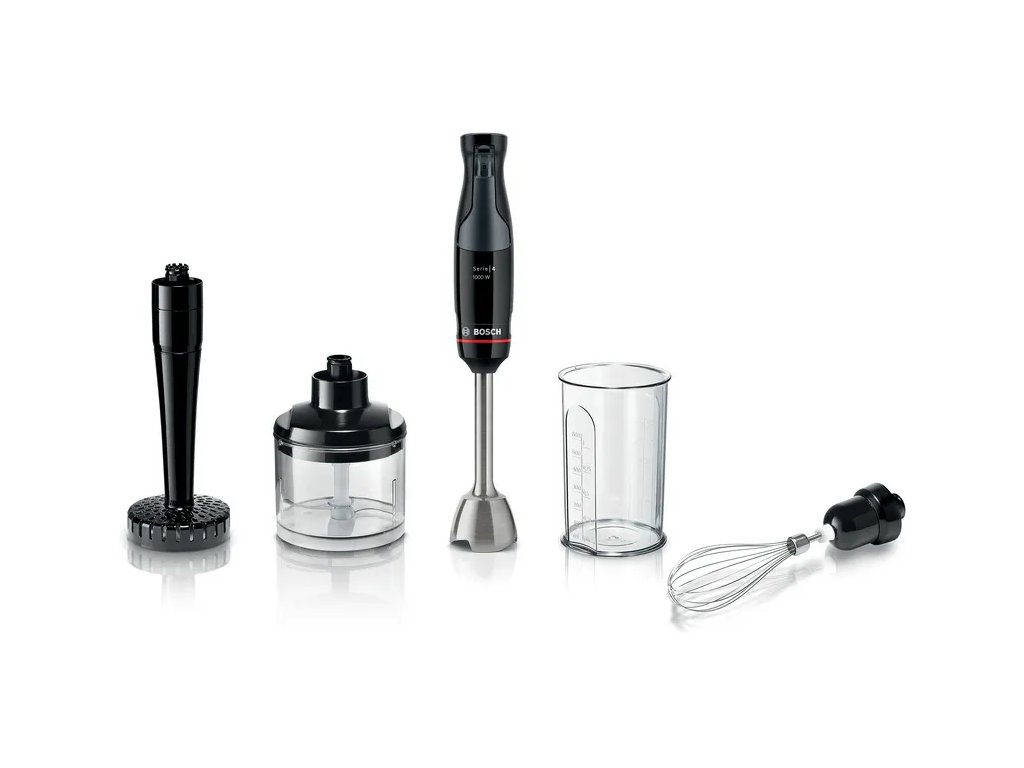 Bosch Serie 4 MSM4B623. Model: Ponorný mixér, Barva: Antracit, Průhledná, Délka šňůry: 1,4 m. Obsah nádoby: 0,6 l, Typ ovládání: Knoflíky. Materiál mixovací mísy: Plast, Základní materiál: Plast, Materiál ostří: Nerezová ocel. Příkon: 1000 W, Napájecí zdroj: AC. Šířka: 57 mm, Hloubka: 78 mm, Výška: 385 mmDoplňkové parametry