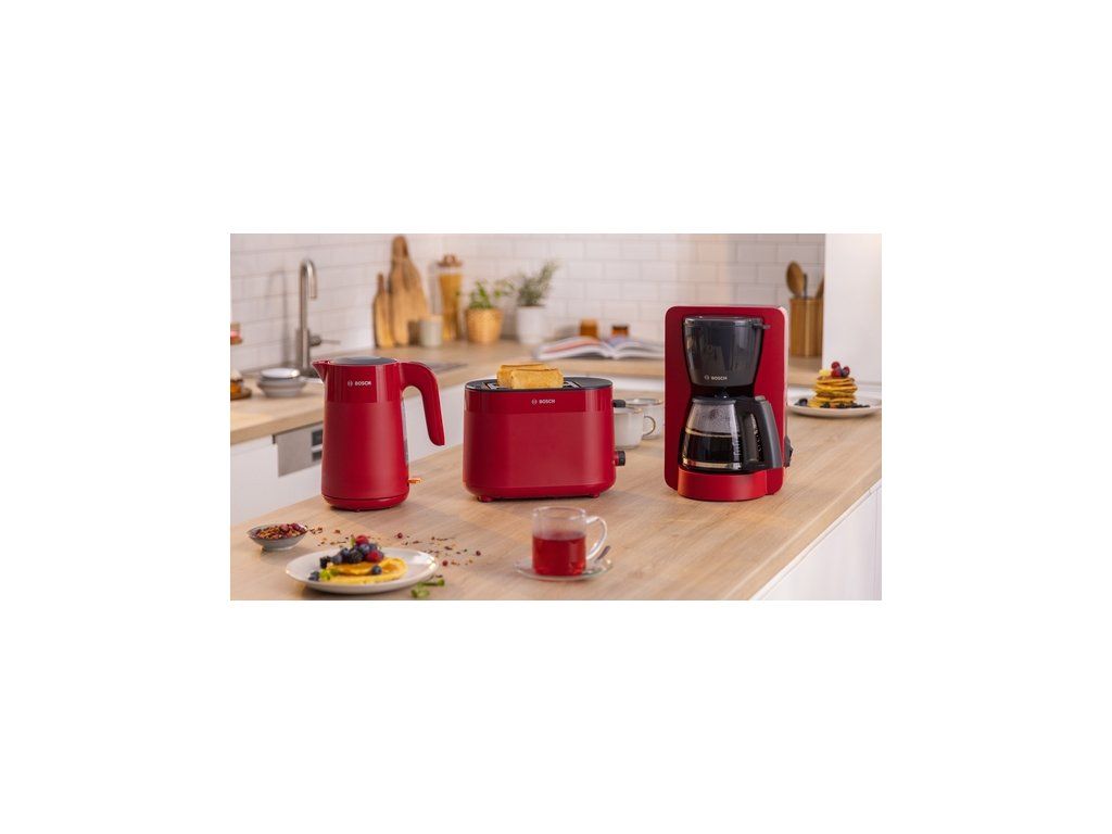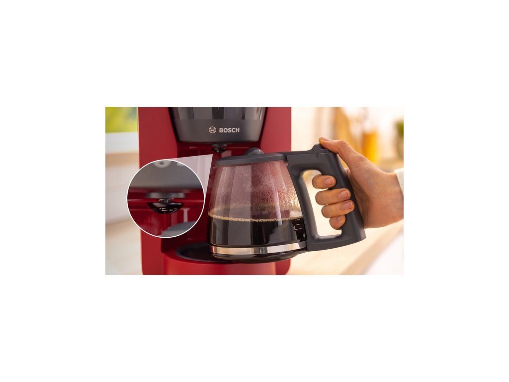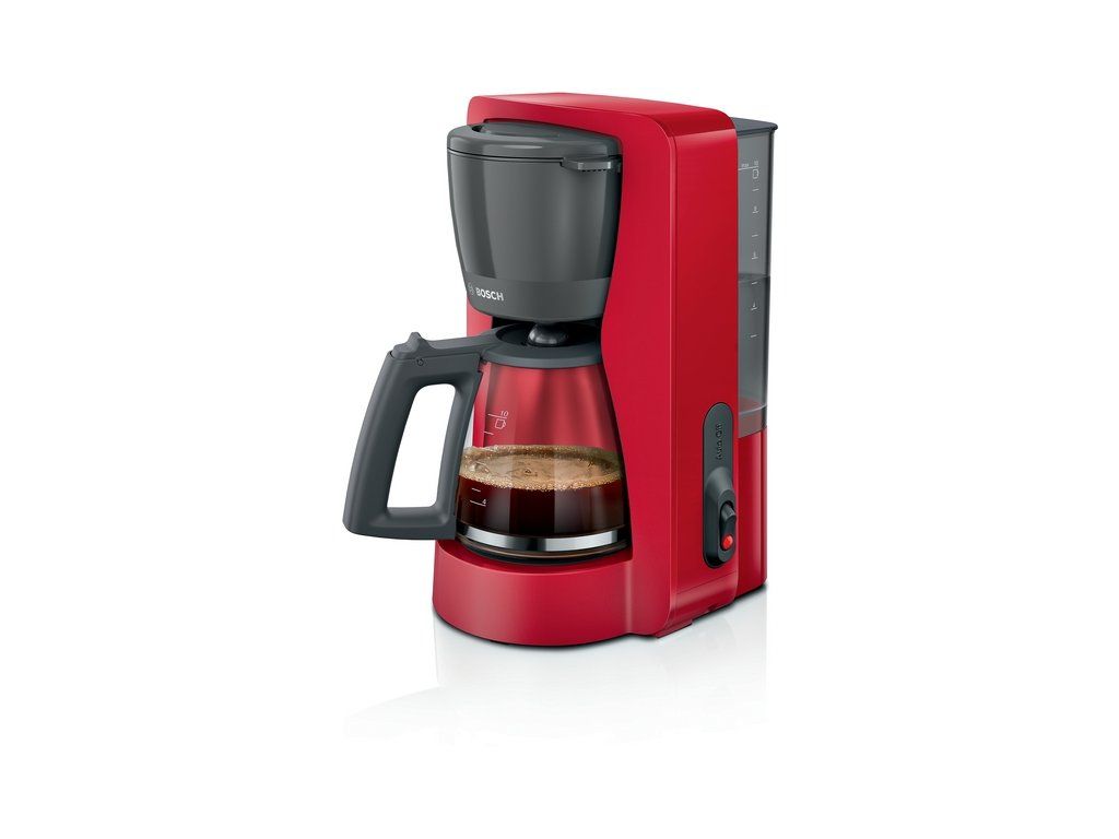 Bosch TKA2M114. Typ produktu: Kávovar na překapávanou kávu, Typ kávovaru: Manuální, Objem zásobníku vody: 1,25 l, Typ náplně: Mletá káva, Zásobník na uvařenou kávu: Pohár, Kapacita v šálcích: 15 hrnků. Barva: ČervenáDoplňkové parametry