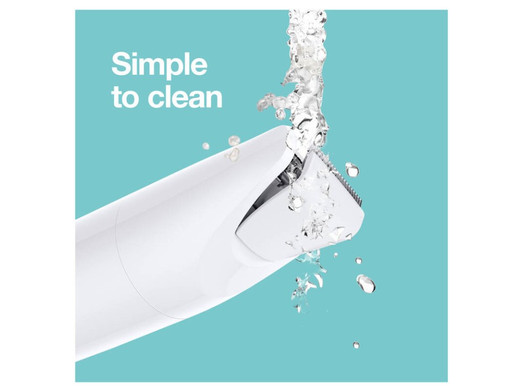 Zastřihovač chloupků je 100% vodotěsný, lze ho tedy používat jak na mokro, tak i na sucho. Po použití jej stačí jednoduše opláchnout. Součástí balení je také zastřihovací nástavec, který je rovněž velmi snadný na údržbu.