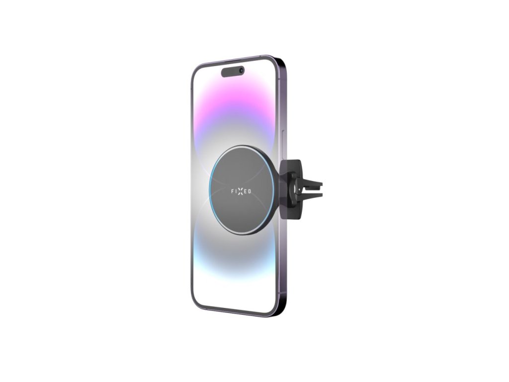 Magnetický držák FIXED MagRound s bezdrátovým nabíjením je navržen na míru telefonům iPhone s MagSafe technologií. Pouhým přiložením k ploše držáku se MagSafe magenty samy přichytí k telefonu a okamžitě započne nabíjení. Plocha držáku kopíruje rozmístění MagSafe magnetů v telefonech iPhone a nezasahuje tak do oblasti fotoaparátu, takže nehrozí jeho poškrábání či neúplné přilnutí. Je tak zajištěno pevné uchycení zařízení i při větších otřesech jízdy, a to i když bude opatřen MagSafe krytem. Zároveň telefon rychle dobije s výkonem až 15 W (v případě iOS max. 7,5 W). Držák se snadno instaluje do každé ventilace auta pomocí kleští se zpětným háčkem, který se zachytí za lamelu ventilace a brání vypadnutí držáku. Pro pohodlnou a bezpečnou jízdu lze snadno jednou rukou nastavit otočným kloubem držáku ten nejlepší pozorovací úhel. Minimalistické rozměry a kovové tělo v černé barvě zaručuje, že se držák stane designovou součástí interiéru auta, jeho vzhled navíc doplňuje decentní LED osvětlení po obvodu držáku. Se stylovým držákem FIXED MagRound máte svůj telefon stále po ruce a vždy plně nabitý, aby vaše cesty byly už jen plné pohody.Vlastnosti: