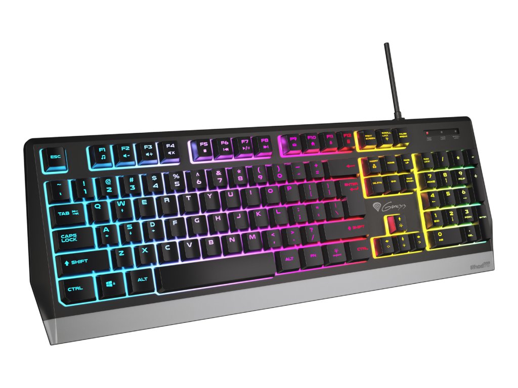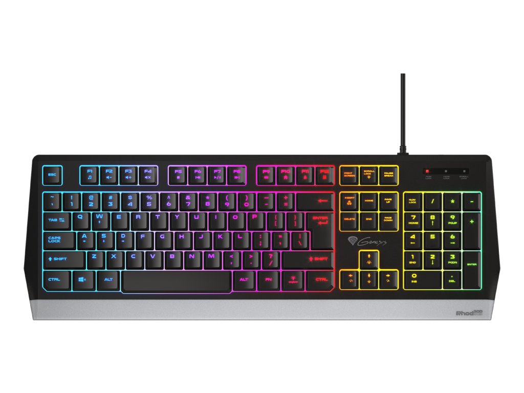 GENESIS Rhod 300 RGB. Formát klávesnice: Plná velikost (100 %). Styl klávesnice: Přímý. Technologie propojení: Kabel, Rozhraní zařízení: USB, Spínače klávesnice: Membránový spínač, Rozvržení klávesnice: QWERTY, Počet kláves na klávesnici: 104. Typ podsvětlení: RGB LED. Délka kabelu: 1,75 m. Doporučené použití: Hraní. Barva: ČernáDoplňkové parametry