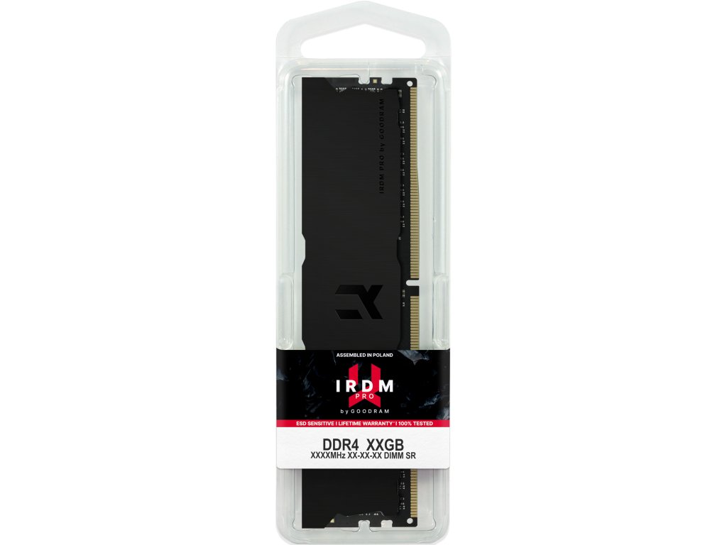 Goodram IRDM PRO. Komponent pro: PC/server, Vnitřní paměť: 16 GB, Rozložení paměti (moduly x velikost): 1 x 16 GB, Typ vnitřní paměti: DDR4, Frekvence paměti: 3600 MHz, Formát paměti: 288-pin DIMM, CAS latence: 18, Barva: ČernáDoplňkové parametry