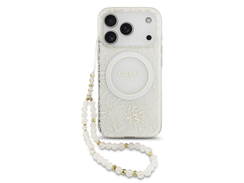 Guess IML Flowers Allover Strap MagSafe Zadní Kryt pro iPhone 17 Pro White