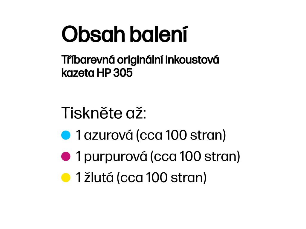 HP Tříbarevná originální inkoustová kazeta 305. Typ barevného inkoustu: Inkoust na bázi barvy, Typ inkoustové kartridže: Standardní výtěžnost, Typ napájení: Balení po jednom, Počet stran (barevný inkoust): 100 str., Objem barevného inkoustu: 2 ml, Tiskové barvy: Azurová, Purpurová, Žlutá, Počet kusů v balení: 1 kusůDoplňkové parametry