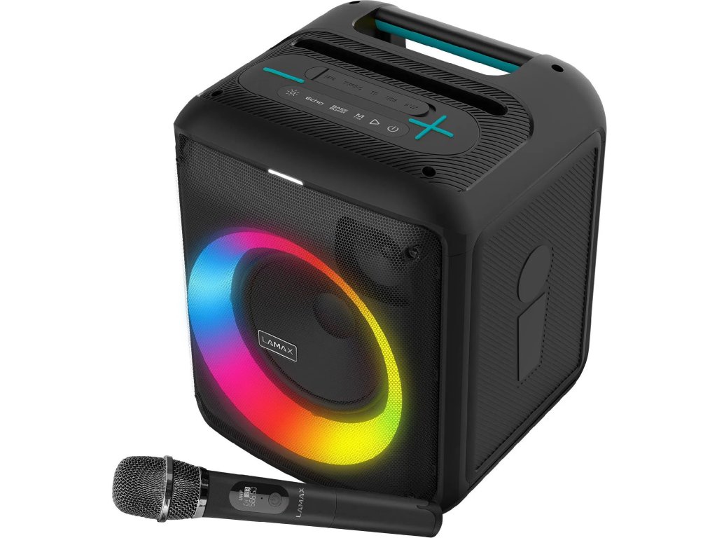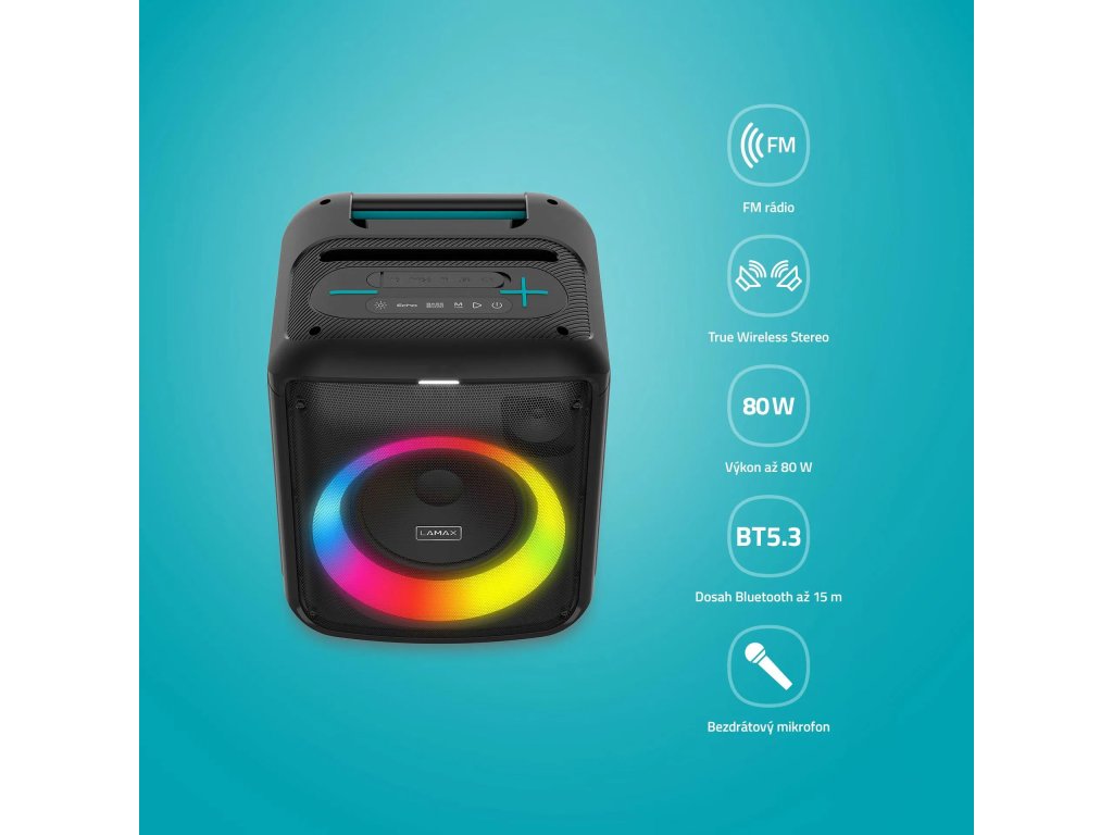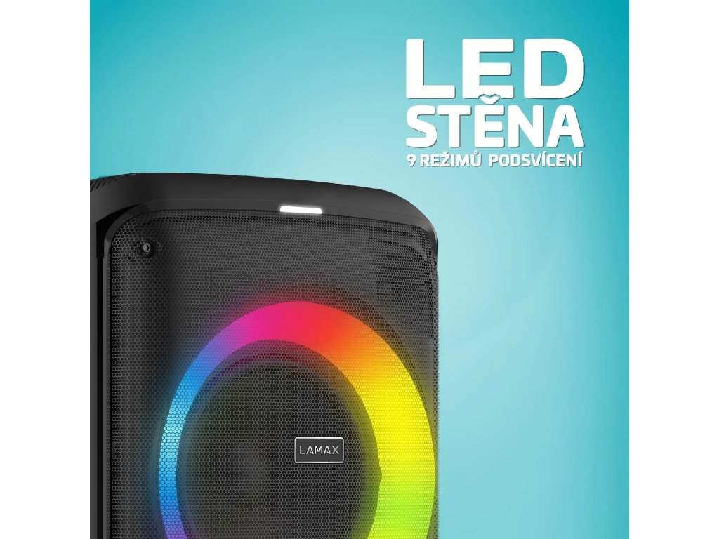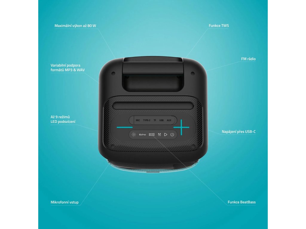 - LED podsvícení, FM rádio, TWS, bezdrátový mikrofon, technologie BeatBass.