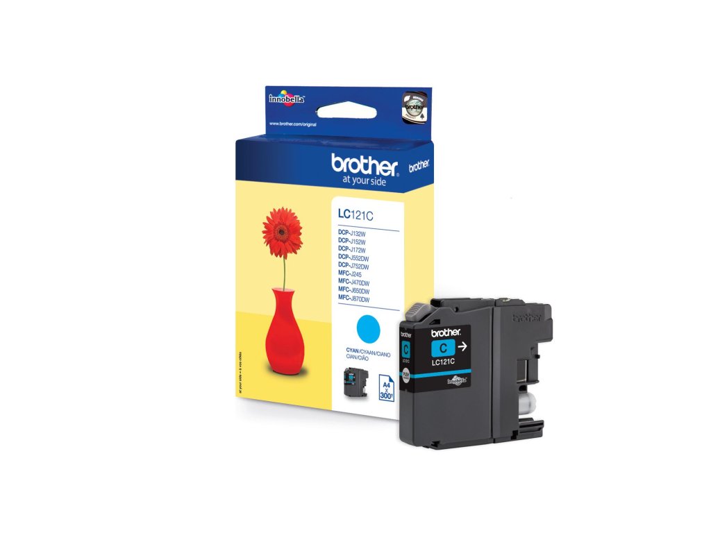 Firma Brother je společnost s dlouholetou tradicí, která se již dlouhou dobu zabývá výrobou tiskových zařízení, jako jsou tiskárny, faxy, psací stroje a multifunkční zařízení. Pro své produkty samozřejmě vyrábí i různé spotřební příslušenství. Výhodou originálního příslušenství je 100% kompatibilita s produkty a maximální kvalita tisku, kterou nelze s neoriginálním příslušenstvím dosáhnout. LC121c je azurová tisková kazeta pro inkoustové tiskárny Brother s označením DCP-J132W/ DCP-J152W/ DCP-J172W/ DCP-J552DW/ DCP-J752DW/ MFC-J245/ MFC-J470DW/ MFC-J650DW/ MFC-J870DW. Pro tento inkoust se udává výtěžnost až 300 stránek při 5 % standardním pokrytí. Výhodou originální cartridge je 100% kompatibilita s produkty a maximální kvalita tisku, kterou nelze s neoriginálními náplněmi dosáhnout.Doplňkové parametry