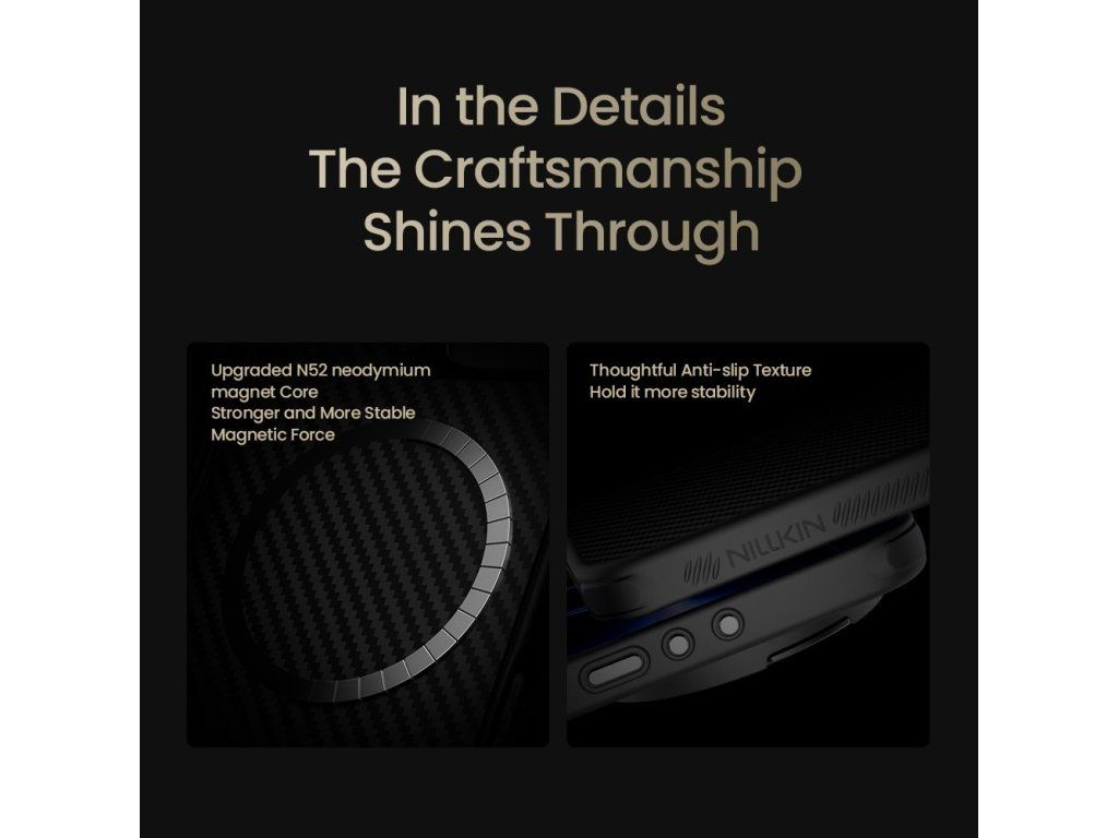 Nillkin CarboProp aramid zadní kryt je vyroben z aramidového vlákna, běžně známého jako "černé zlato" v materiálovém průmyslu. Aramidová vlákna a TPU poskytuje vašemu telefonu komplexní ochranu. Zadní strana: Vojenský materiál, 5x pevnější než ocel. Rámečky: TPU měkký rámeček, 360° ochrana. Fotoaparát: Kovový rámeček zabraňuje nárazům a poškrábání. Přední strana: 0,5 mm zvednutý rámeček pro ochranu displeje. Kreativní design kovového rámu kolem fotoaparátu nejen chrání fotoaparát, ale také slouží jako stojánek. Díky vestavěnému silnému magnetu si můžete MagSafe užívat podle libosti. Vyznačuje se dobrými izolačními a nevodivými vlastnostmi, které neovlivňují používání GPS, sítě, signálu a bezdrátového nabíjení. - Vlastnosti: - Aramidové vlákno - TPU materiál - Kovový rámeček kolem fotoaparátu, který zároveň slouží jako stojánek. - Zvýšené rámečky kolem displeje - Silný magnet N52 - Přesné výřezy - Neomezuje signál, ani bezdrátové nabíjeníDoplňkové parametry