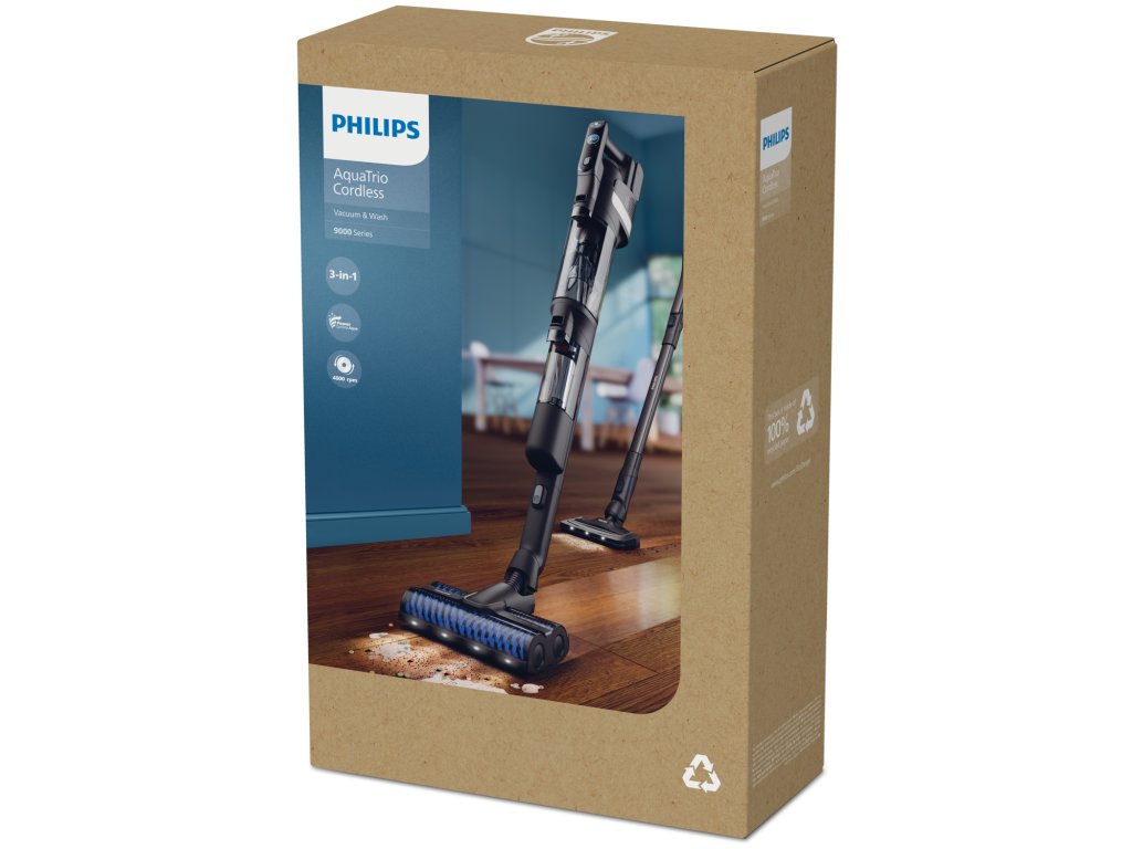 Philips Bezdrátový vysavač AquaTrio s vytíráním 9000 Series. Typ produktu: Tyčový vysavač 2 v 1, Typ nádoby na prach: Bezsáčkové, Barva: Černá. Vysávání: Suché a mokré, Metoda oddělování nečistot: Cyklónový. Napájecí zdroj: Baterie, Typ baterie: Lithium-ion (Li-ion), Napětí baterie: 25,2 V. Šířka: 300 mm, Hloubka: 260 mm, Výška: 1180 mm. Včetně náhradních kartáčů: Čisticí kartáč, Mini turbo kartáčDoplňkové parametry