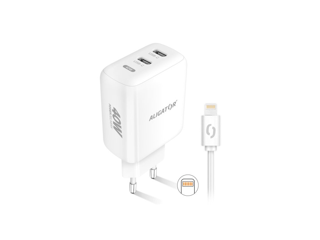 Rychlá nabíječka ALIGATOR, PD 40W, 2xUSB-C, USB-C/Lightning kabel, bílá