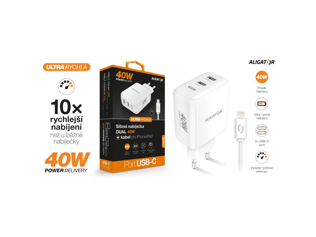 Výkonná a SMARTRychlá síťová nabíječka 2xUSB-C ALIGATOR Power Delivery 40W s kabelem USB-C/Lightning pro iPhone/iPad
