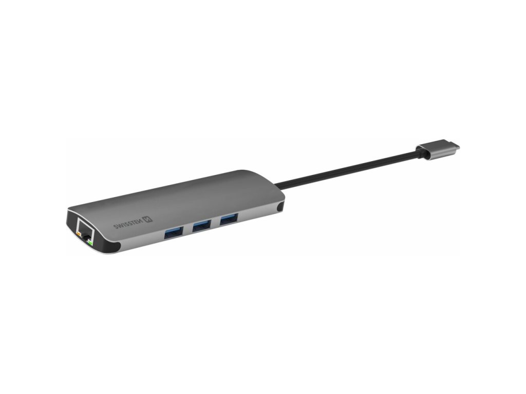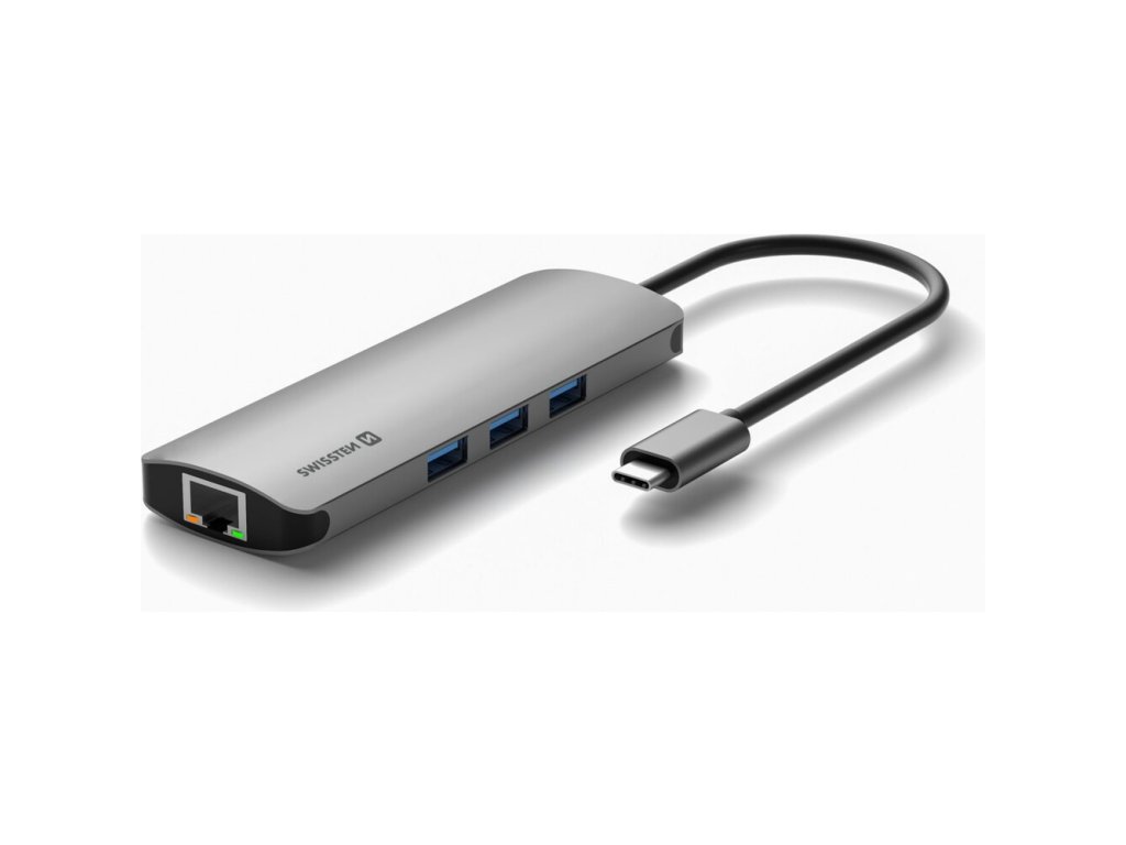 Hliníkový USB-C HUB Swissten 8v1 s jedním portem USB-C, třemi USB 3.0, 1xHDMI, 1xRJ45, čtečkou karet mikroSD a SD. Baleno v blistu Swissten.