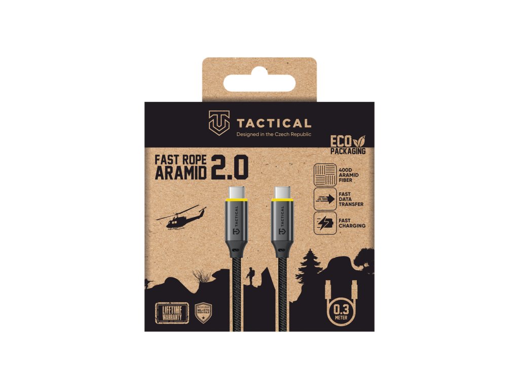 TACTICAL FAST ROPE 2.0 Kabel s vysokou odolností pro každodenní použití, který nabízí rychlé 100W nabíjení a zvládne napájet telefon, tablet i notebook. Podporuje přenos dat až do rychlosti 10 Gb/s. Zesílený aramidovým vláknem, aby vydržel i ty nejnáročnější podmínky. Opletení z odolného nylonu zajišťuje maximální pevnost a dlouhou životnost. Fast Rope 2.0 je vybaven originálními konektory ze slitiny hliníku, které prodlužují životnost kabelu. Testováno dle MIL-STD. PŘIPRAVEN DO AKCE Podporuje standard USB3.1 s rychlonabíjením o výkonu až 100W a přenosovou rychlostí dat 10Gbps. Originální konektory vyrobené ze slitiny hliníku jsou navrženy tak, aby odolaly opakovanému namáhání v místě ohybu a zaručují spolehlivost bez ohledu na používané zařízení. KONSTRUKCE, KTERÁ VYDRŽÍ Kabel je vyztužen aramidovým vláknem, které zajišťuje výjimečnou pevnost a odolnost proti ohýbání i každodennímu opotřebení. Kovové tělo konektorů chrání nejvíce namáhaná místa při opakovaném ohybu, zatímco opletení z nylonu přidává další vrstvu odolnosti. MIL-STD TESTOVÁNO Tactical Fast Rope 2.0 splňuje požadavky vojenské normy MIL-STD-810H 516.8, která potvrzuje jeho vysokou odolnost i v náročných podmínkách PRAKTICKÝ ZÁMEK Integrovaný silikonový zámek umožňuje snadné uložení kabelu a jeho rychlé použití, kdykoliv je potřeba. TOO DURABLE TO RESIST V Tactical klademe důraz na detaily. Fast Rope 2.0 patří ke špičce ve své třídě díky použití odolných materiálů a moderních technologií, které zajišťují spolehlivý výkon a dlouhou životnost. Proto je tento kable zahrnut v našem programu doživotní záruky. *Viz podmínky programu doživotní záruky Tactical. BE ECO Záležitosti nám na životním prostředí. Všechny naše produkty Tactical balíme do ekologických obalů z recyklovaného papíru, abychom minimalizovali dopad na přírodu.Doplňkové parametry