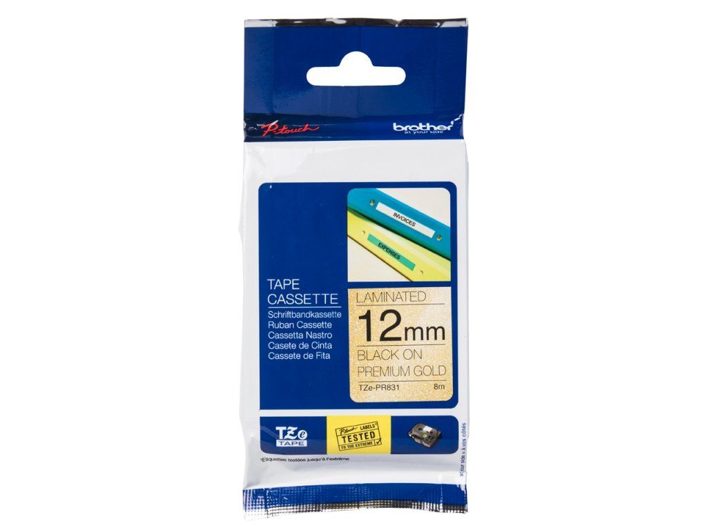 Brother originální páska do tiskárny štítků, Brother, TZE-PR831, černý tisk/zlatý podklad, laminovaná, 8m, 12mm Černý text na třpytivé zlato Šířka 12 mm, délka 8 m Originální kazeta Brother ve vysoké kvalitě Poskytuje trvanlivé, snadno čitelné výsledkyDoplňkové parametry